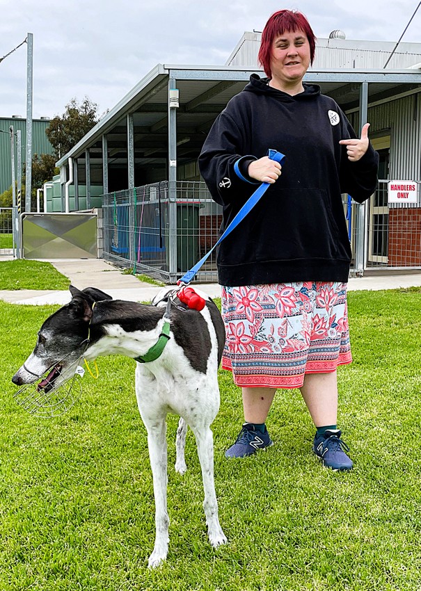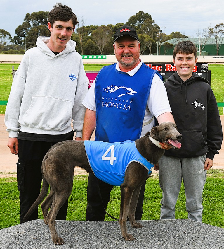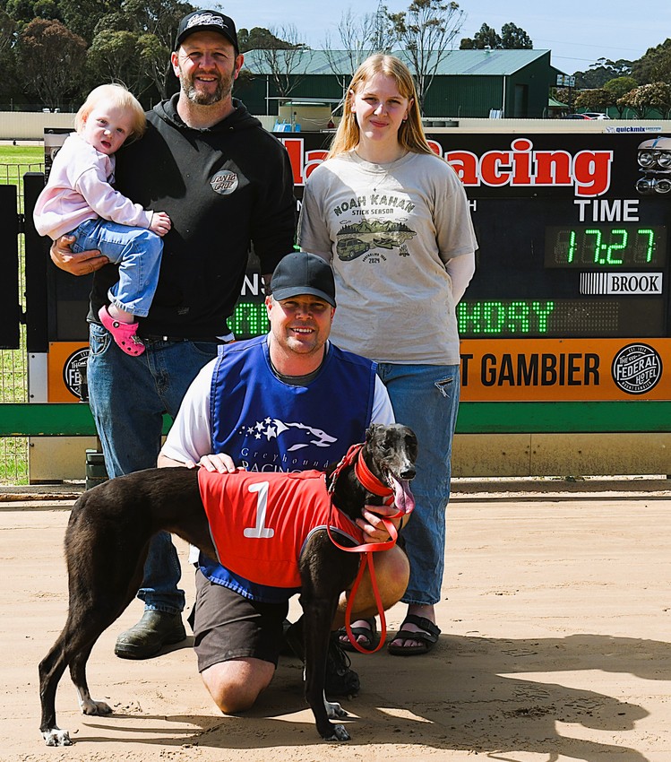 RECORD BREAKER: Elaine, Jason and Zari Newman, together with trainer Dave Green and Wind Whiskers after her record-breaking win over 305 metres at Tara Raceway last Sunday.