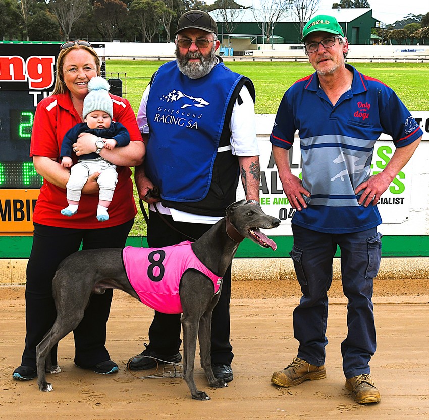 Grandma Elysia Bartholomew (Gigi) pictured with young Alfie (6 months) who catches up with his namesake Just Alfie, winner of the second heat of the Kevin Jones Grade 5 series (400 m). Also pictured are Pa Bartholomew (Steve) and Grumps Manterfield (Tim).