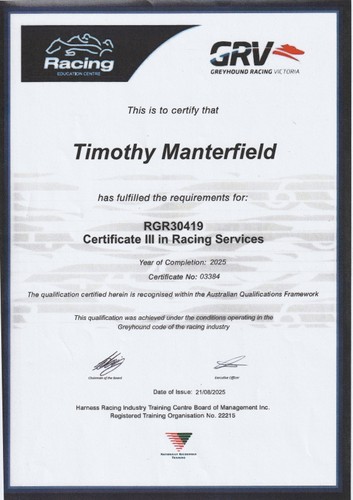 Under the conditions operating in the greyhound code of the racing industry, Mount Gambier Greyhound Racing Club track manager Tim Manterfield has fulfilled the requirements for Certificate III in Racing Services.