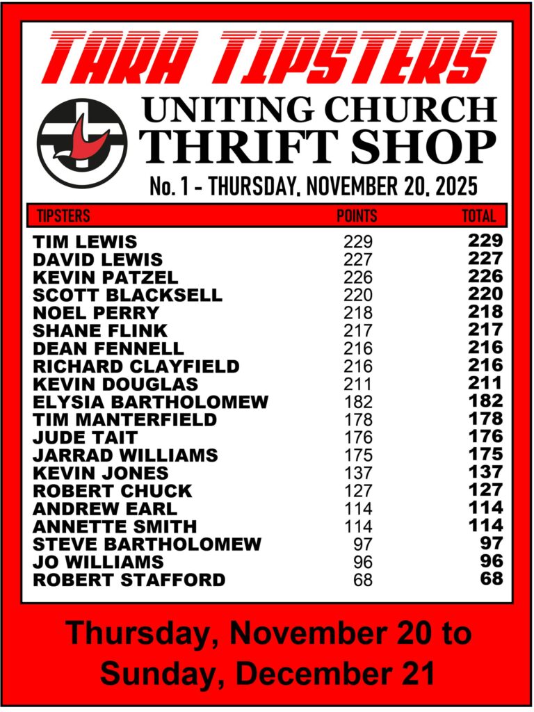 Vicki Clark receives a Tara Tipsters cheque for the 2022 Mount Gambier Community Christmas Day Luncheon.The Quaran Care presentation in November 2022. Winner of the Tara Tipsters Cup was Kevin Mugavin’s Classic Moment.The Four Reasons Why Tara Tipsters Cup presentation to Captain Larry at Tara Raceway in July.The Tara Tipsters Grantville Court Thrift Shop presentation at Tara Raceway on Sunday, March 27, 2022.The Border Watch, March 2022.Foodbank presentation at Tara Raceway. Lynne Neshoda of Foodbank holds the cheque with MGGRC president Noel Perry after Tim Richards’ Two Hands George had won the Foodbank Mixed Stake.Sunday, November 27, 2021. Members of the Tara Tipsters team. Back (from left), Monty Wilson, Jason Newman, Michael Robinson, John Hawker. Front, John Little, Kerry Hawker, Kevin Douglas, David Lewis and Richard Clayfield.